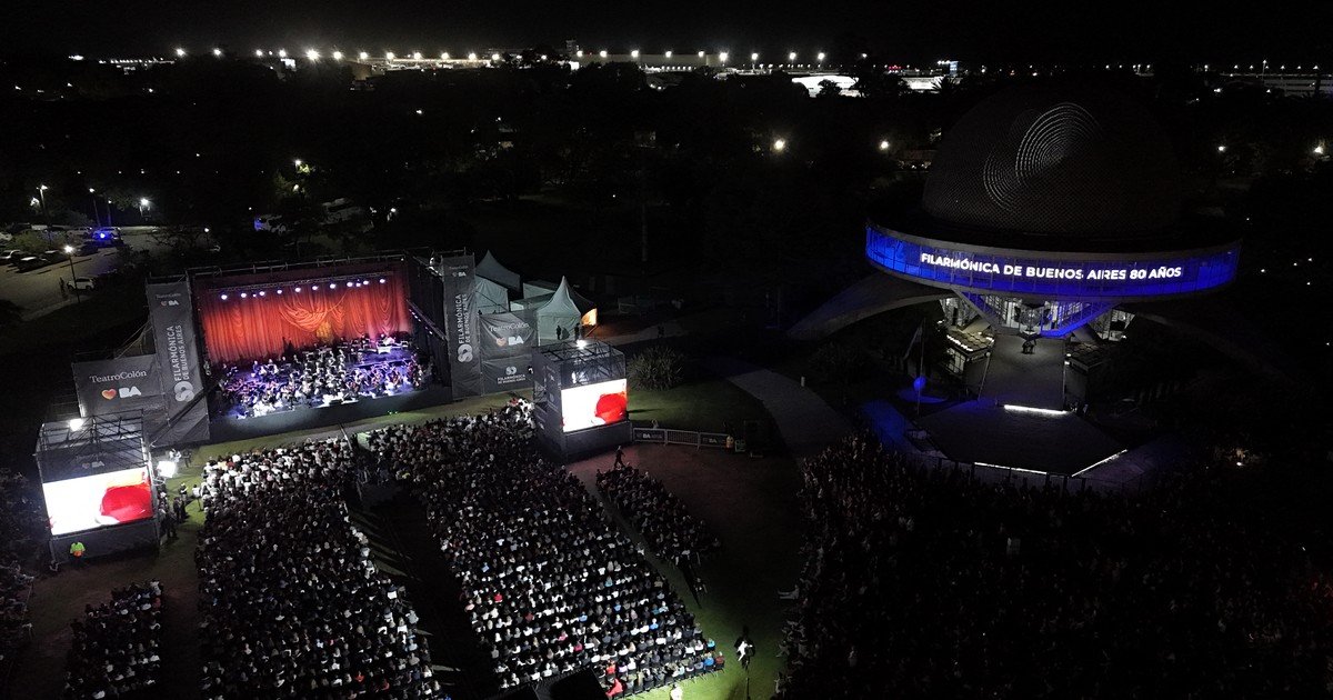 Es una de las últimas noches de un verano porteño que no parece tener apuro en despedirse. No es fácil conseguir un sitio o acercarse al lugar: una impresionante multitud, difícil de calcular, está apostada desde temprano en las afueras del Planetario. No se trata ni de una cita esotérica ni de una actividad astronómica. Los miles, de todas las edades, distribuidos en un radio enorme, de pie, en reposeras o sentados en el suelo, están listos para disfrutar de uno de los conciertos gratuitos con que la Filarmónica de Buenos Aires celebra sus 80 años.