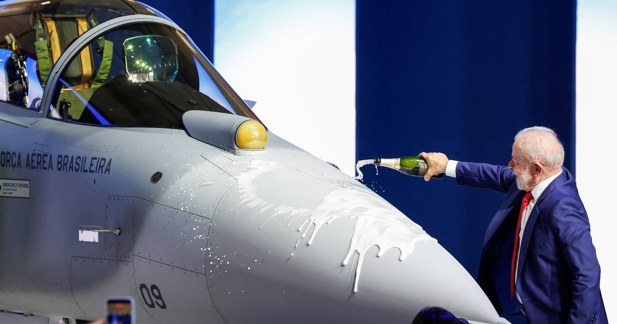 A continuación, el presidente de Brasil, Luiz Inácio Lula da Silva, derramó champán sobre la aeronave para bautizarla y sobrevoló la región escoltado por el caza.